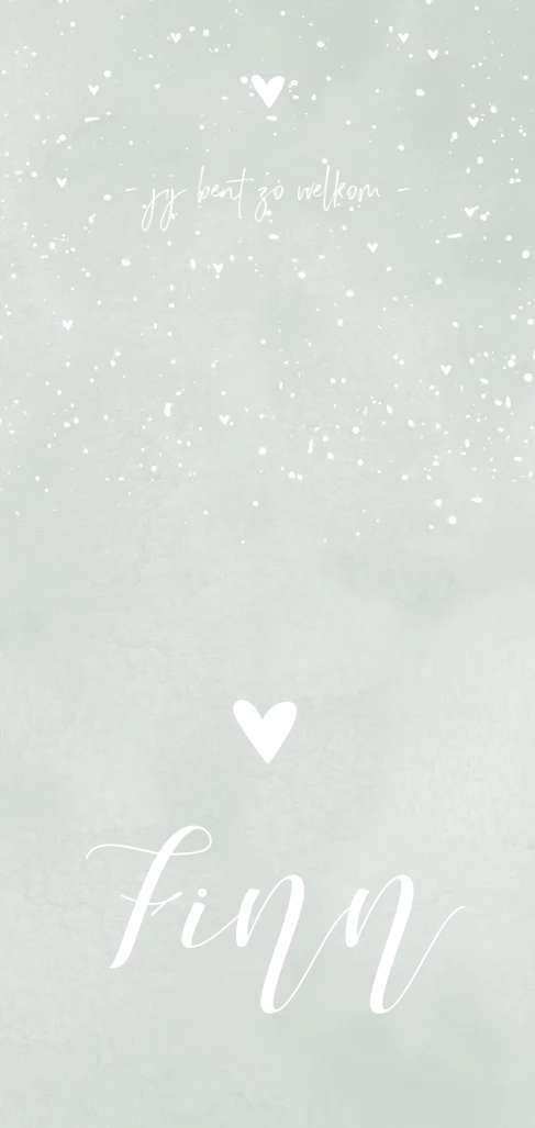 Trendy geboortekaart voor een jongen met een grijsgroene achtergrond en witte spetters. De naam en de hartjes worden in goudfolie gedrukt.