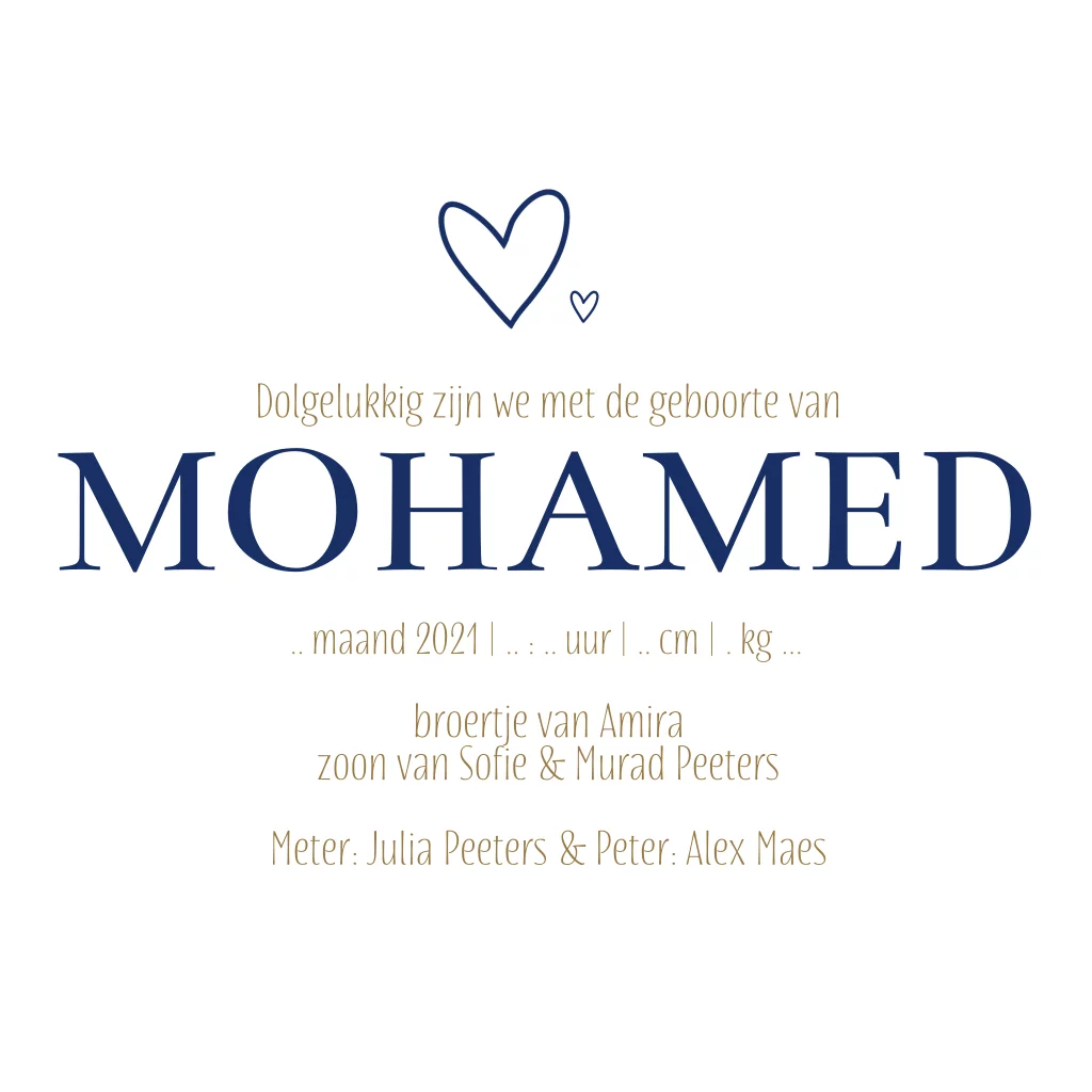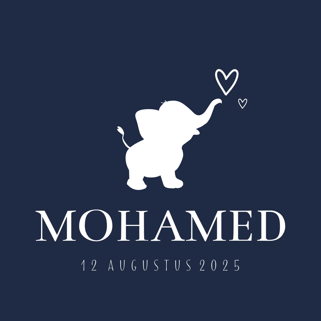 Hip donkerblauw geboortekaartje voor een jongen met een grappig olifantje in goudfolie met twee kleine hartjes erboven. De naam staat in een strak modern lettertype, liever een andere typografie of kleur? In de online editor pas je dit eenvoudig aan en voeg je persoonlijke tekst toe.Bekijk ons babyborrelkaartje.