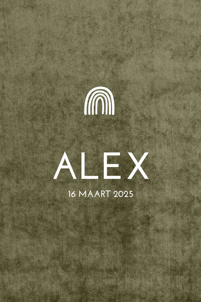 Hip geboortekaartje met regenboog en de naam van jullie zoon in goudfolie. Het kaartje heeft een olijfgroene fluweellook achtergrond en een mooi minimalistisch ontwerp. Bewerk dit kaartje naar wens in de online editor.