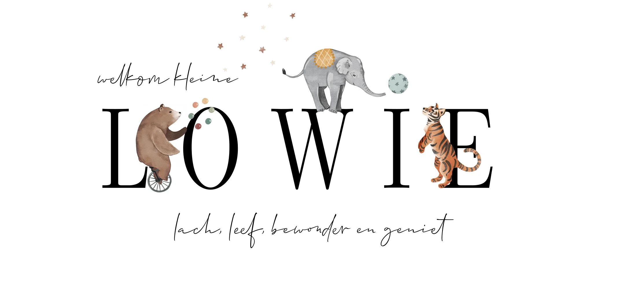 Een vrolijk geboortekaartje met een circusthema. Op het kaartje staan verschillende circusdieren, zoals een beer, olifant en een tijger afgebeeld. Personaliseer het naar eigen wens in de editor.Bekijk ook ons babyborrelkaartje.