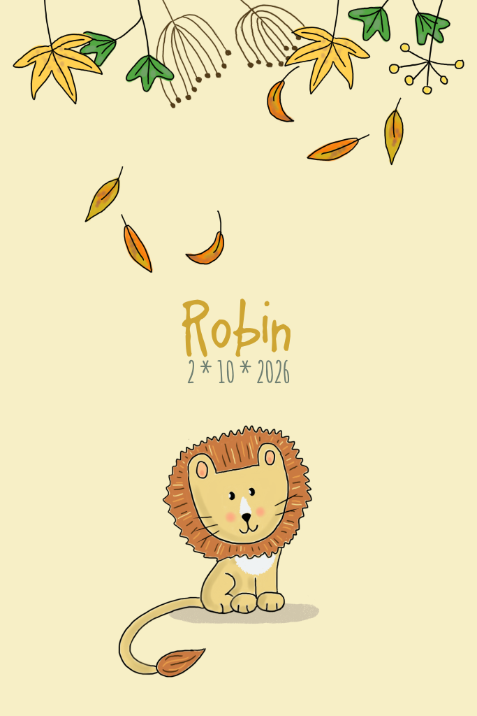 Lief geboortekaartje met een grappig leeuwtje in de herfst. De achtergrond is okergeel met gebladerte bovenaan en naar beneden dwarrelende blaadjes. Je kunt eenvoudig zelf de kleur en de tekst aanpassen in de online editor.
