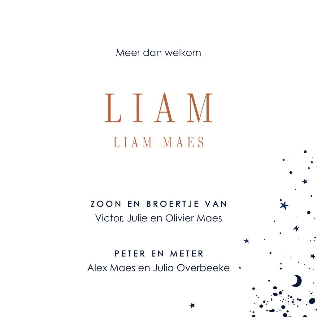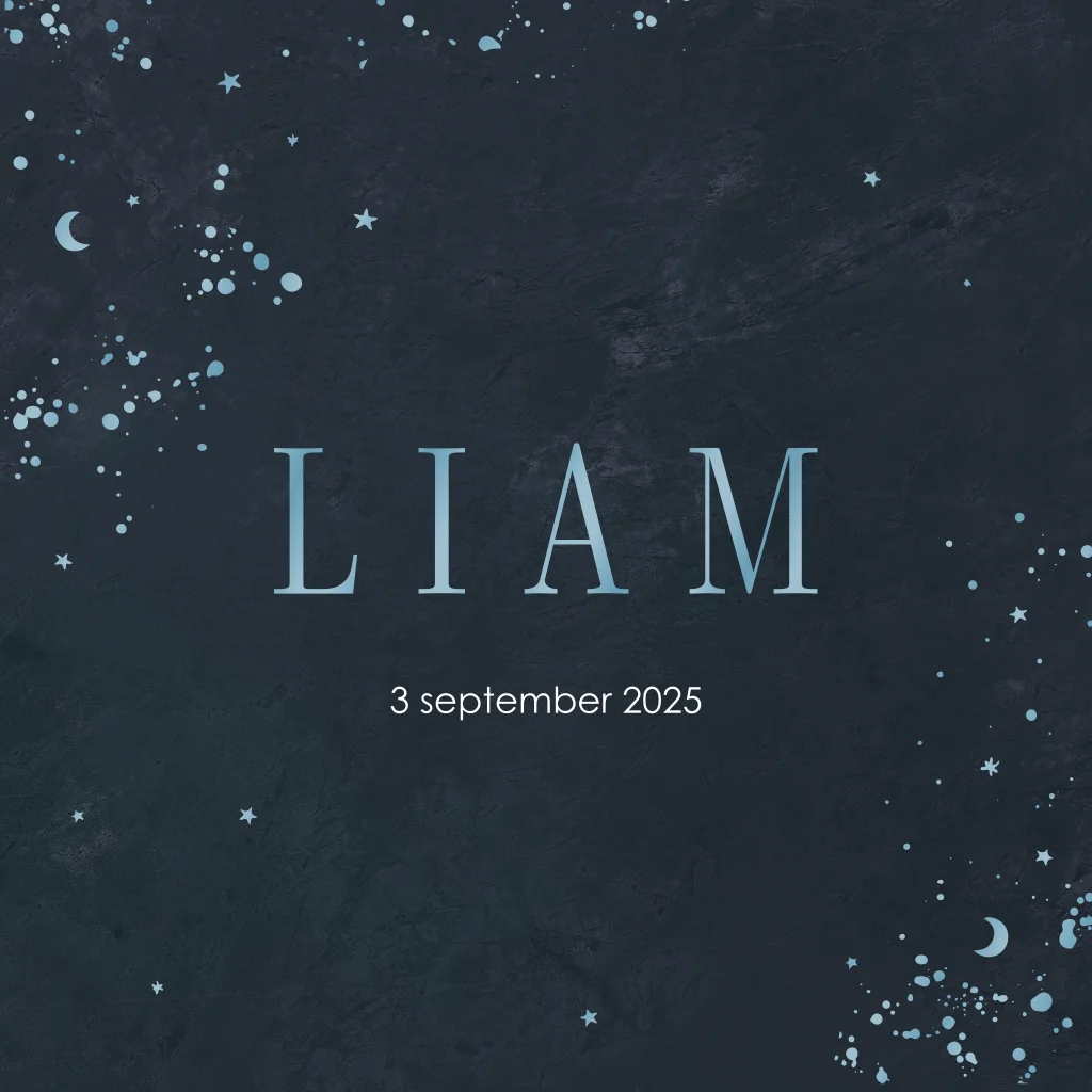Een vierkant geboortekaartje met verschillende details van hoogglans. Zo is de naam van hoogglans, evenals de spetters eromheen. Personaliseer het kaartje naar eigen wens in de online editor.