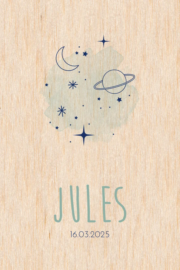 Op zoek naar een hip geboortekaartje? Dan is dit écht houten kaartje misschien iets voor jouw zoon. Het kaartje heeft een design met een sterrenhemel en het heelal. In onze online editor kun je het kaartje gemakkelijk aanpassen.
