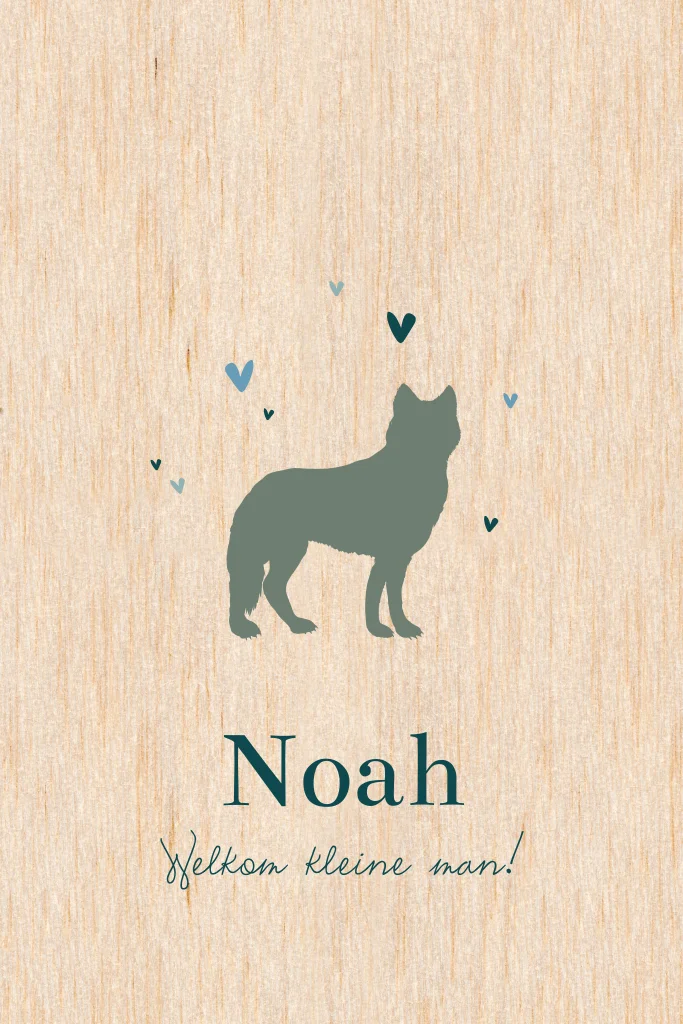 Wat een lief kaartje voor jullie pasgeboren zoontje! Er is in het midden een silhouet van een vos te zien met daar omheen wat kleine hartjes in groen. Dit design wordt gedrukt op echt berkenhout voor een unieke uitstraling.