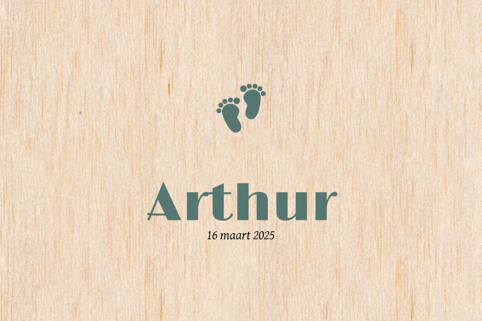 Liggend geboortekaartje van echt hout met afgeronde hoeken. Stoer kaartje met een silhouet van voetjes en de naam in een modern lettertype in groen.| Totaalprijs: 0 |