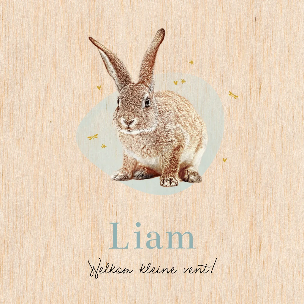 Bijzondere geboortekaart op echt hout voor de geboorte van jullie zoon. Deze kaart heeft een mooi getekend konijn, hartjes en sterretjes op een lichtblauw vlak. Door de ronde hoeken heeft deze kaart een zachte uitstraling.