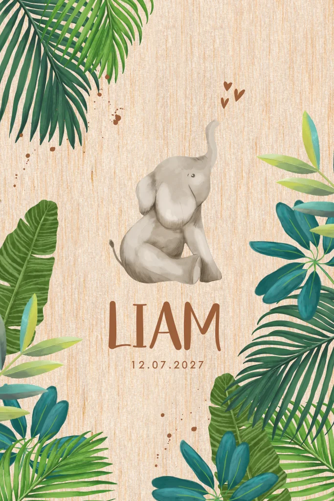 Hout geboortekaartje met olifantje en jungle bladeren