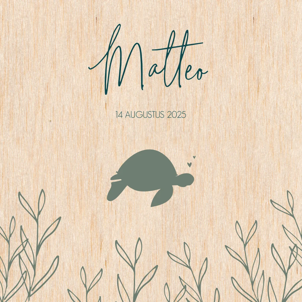 Vierkant geboortekaartje van echt hout met een silhouet van een schildpad en getekende takjes in groen.