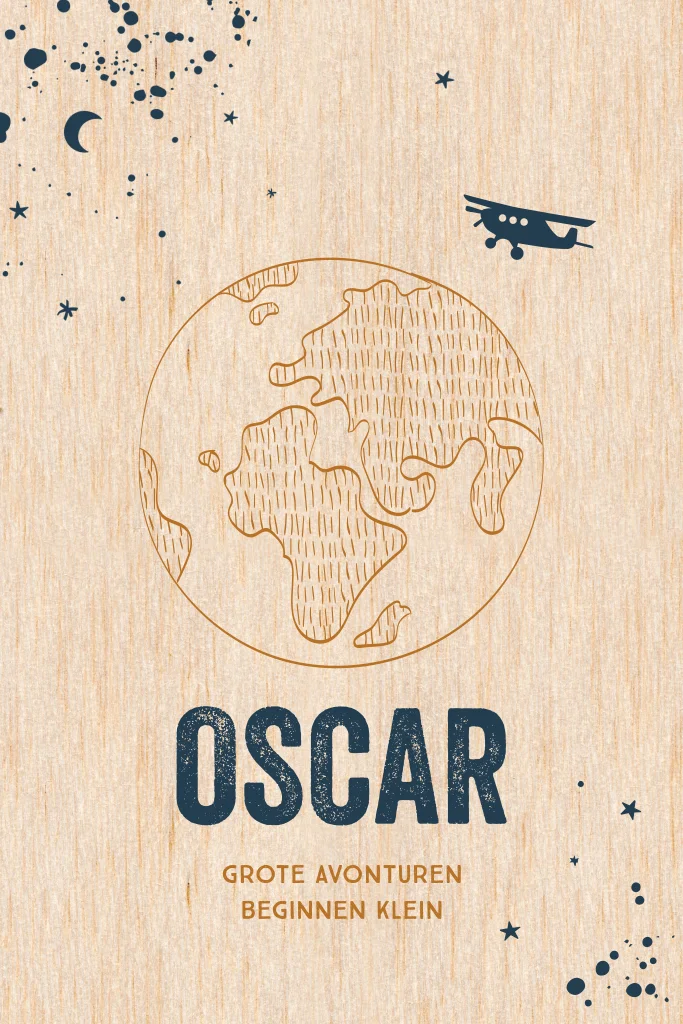 Hip, houten geboortekaartje voor een jongen met een wereldbol in bruin, het vliegtuigje en de maan en sterretjes zijn in het blauw. Liever een andere kleur? Pas het zelf naar eigen wens aan in de online editor.Bekijk ook ons babyborrelkaartje.