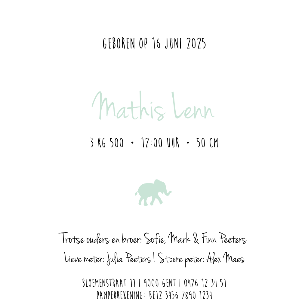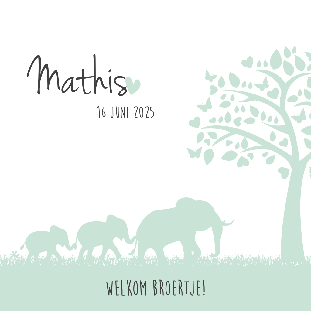 Een lief en hip silhouet geboortekaartje in mintgroen! Drie olifanten lopen in een landschap met een boom. Leuk kaartje voor een zoontje! Maak hem zelf compleet met eigen teksten in de online editor of bekijk de goudfolie-versie eerst.