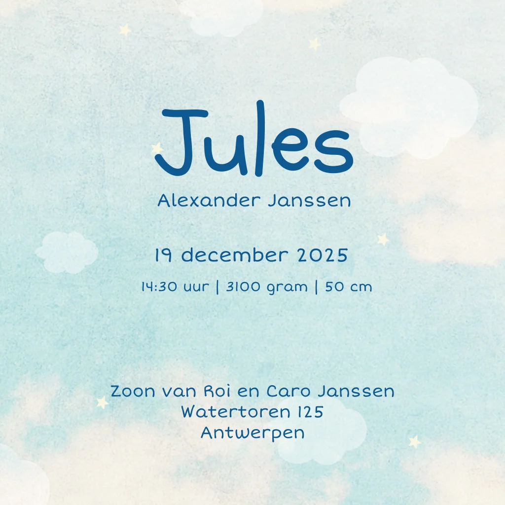 Een echt vintage geboortekaartje met een zwaaiend jongetje in een vliegtuig met een eendje naast zich. Op de achtergrond een dromerige wolkenlucht met vogeltjes en de maan en sterren. Met een bijpassend lettertype maak je dit kaartje helemaal af, pas zelf de tekst aan in de online editor, zo gedaan!
