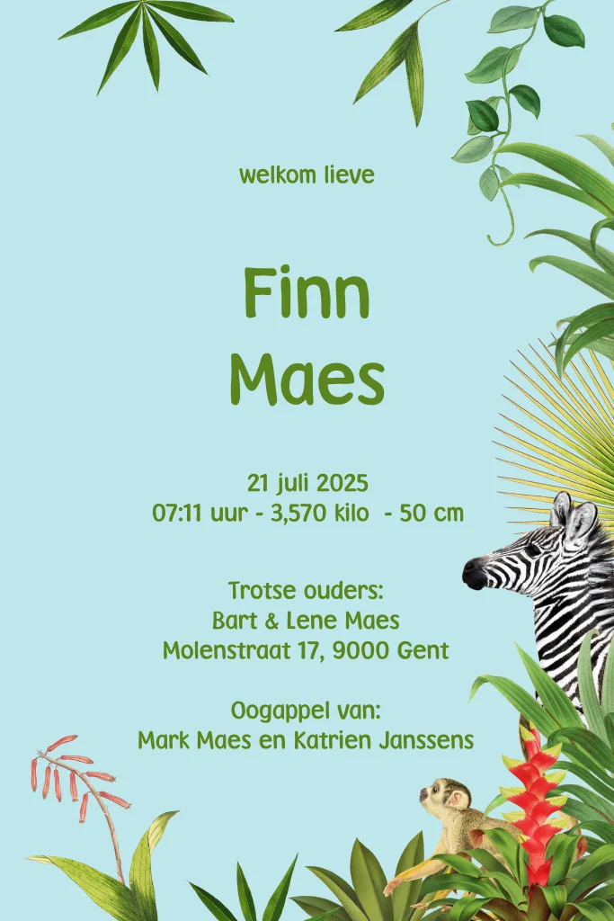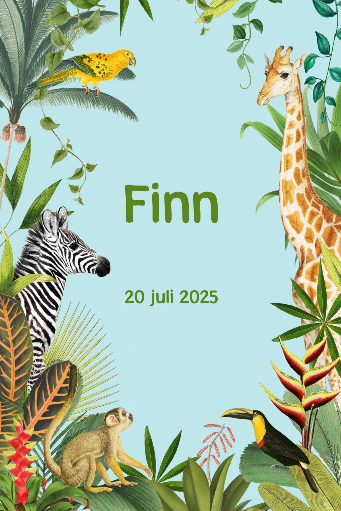 Stoer blauw jungle geboortekaartje met giraffe, aapje, zebra, papegaai en toekan met gebladerte op de achtergrond. De binnenzijde is ook geïllustreerd in junglethema. De tekst kan naar wens aangepast worden in de online editor.