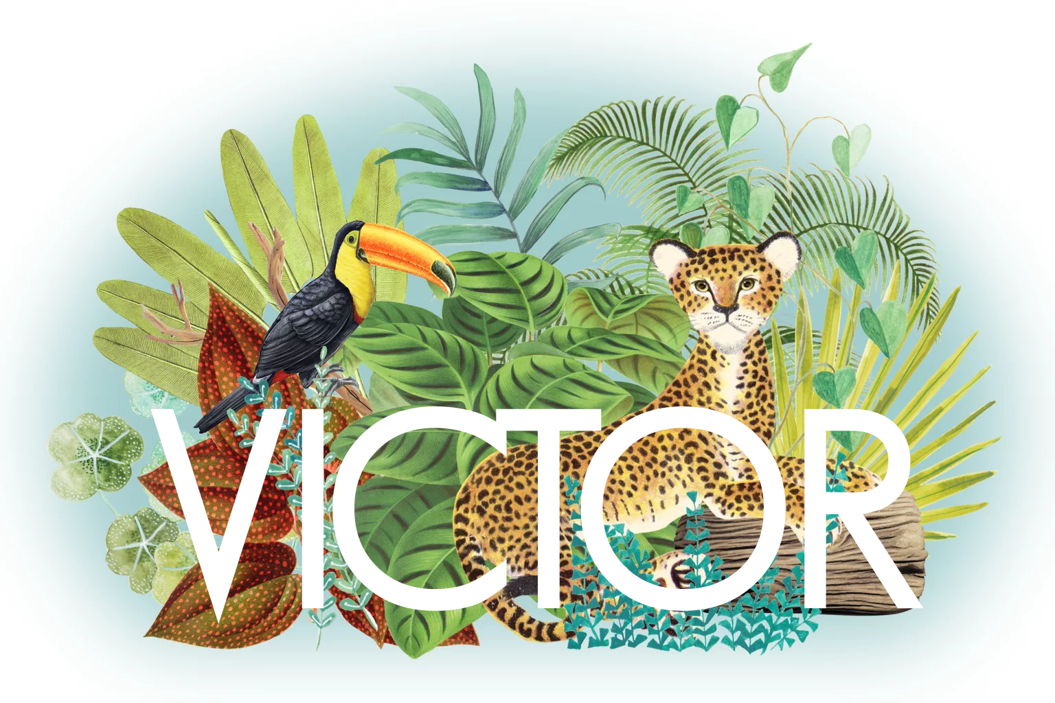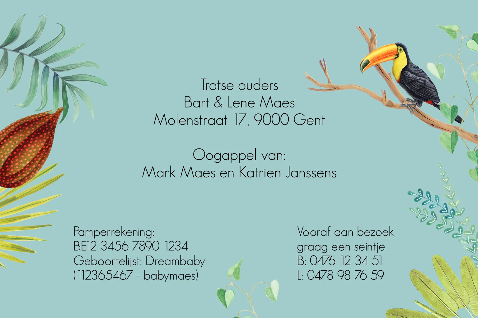Een mooi avontuurlijk geboortekaartje in een junglethema met een panter en toekan tussen de junglebladeren. De naam staat in goudfolie, waardoor deze mooi naar voren komt op de groene achtergrond.