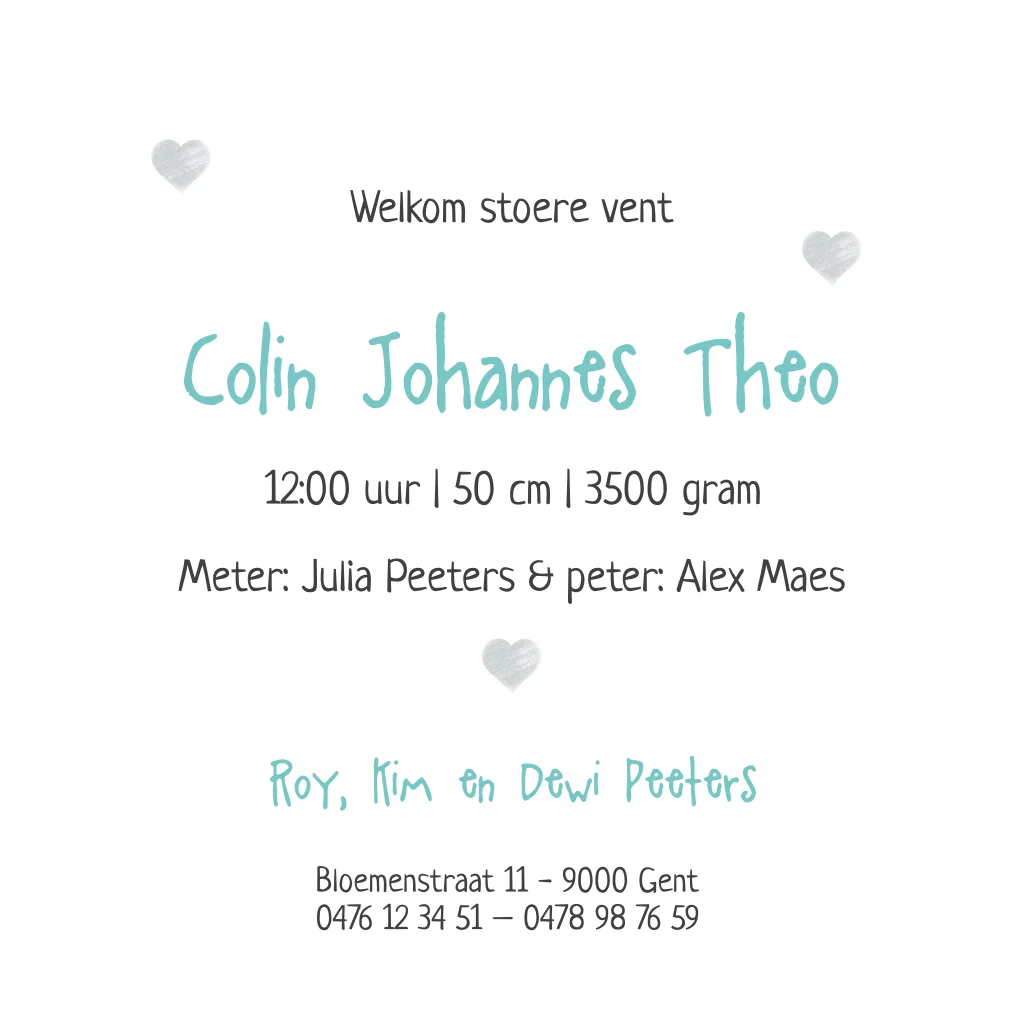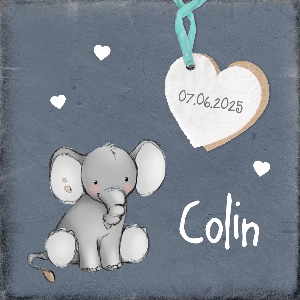 Lief geboortekaartje voor jullie zoontje met een jeansblauwe achtergrond. Op het hart kun je de geboortedatum van de kleine zetten. Naast het grappige zittende olifantje staat de naam van de newborn in zilverfolie. De kleine hartjes zijn ook in zilverfolie, dat geeft een extra mooie look!Heb je ook ons bijpassende babyborrelkaart al gezien?