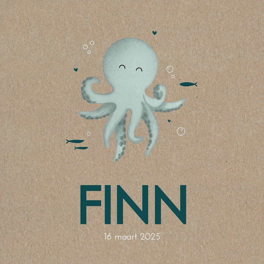 Een lieve kaart van echt kraftpapier om de wereld te laten weten dat jullie zoontje is geboren. Het grappige blauwe octopusje in het midden zorgt voor een vrolijke touch. Met de naam in modern lettertype is dit kaartje helemaal hip! Liever toch een andere letter of kleur? In de online editor is het ontwerp helemaal naar eigen wens aan te passen.