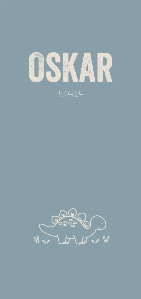 Dit leuke kaartje is perfect voor de geboorte van een jongen. De kaart is langwerpig en lichtblauw en heeft een schattige getekende dino. De naam staat in stoere letters bovenaan.