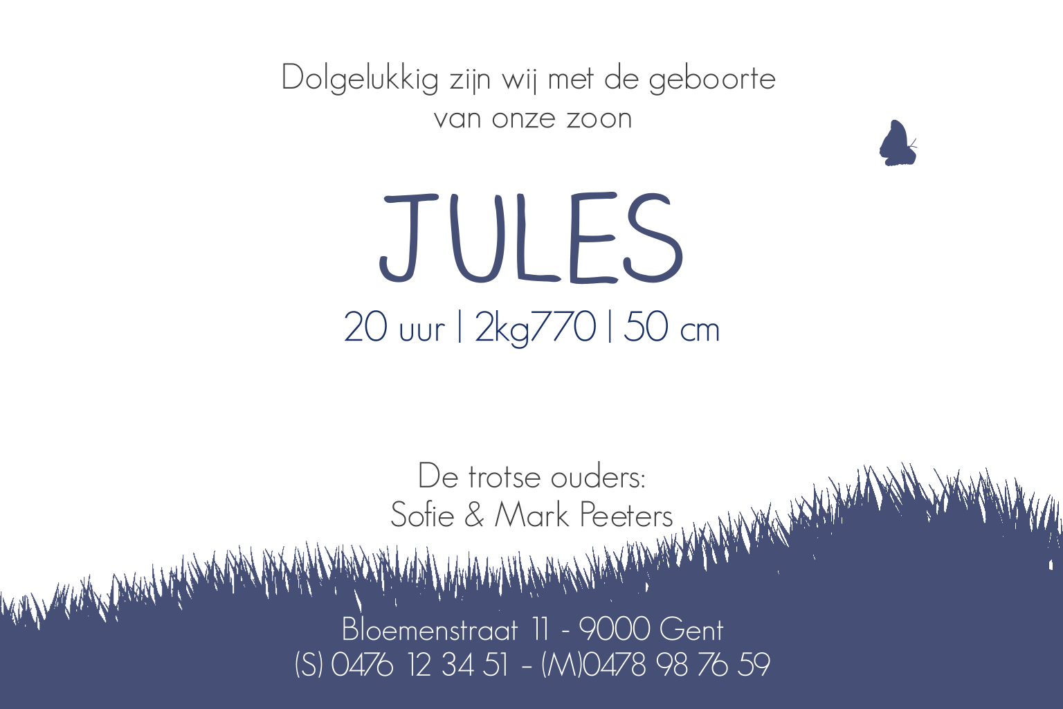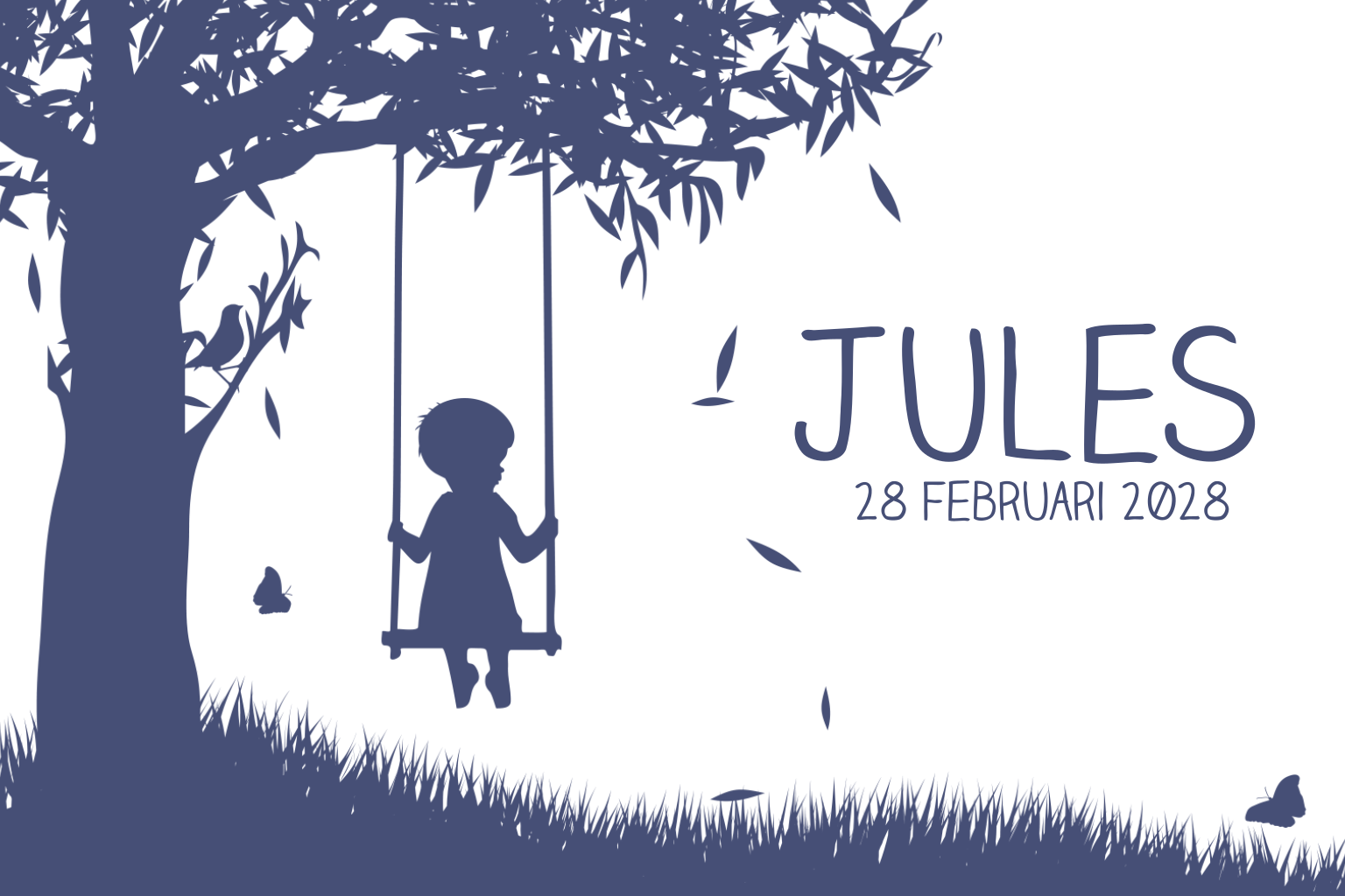 Schattig babykaartje voor de geboorte van jullie zoontje. In blauw het silhouet van een jongetje op de schommel aan een boom in het gras. Hier en daar fladderen vrolijke vlinders en in de boom zit een klein vogeltje. Je hoeft alleen nog maar de teksten aan te passen in de online editor en je kaartje is klaar om te bestellen!