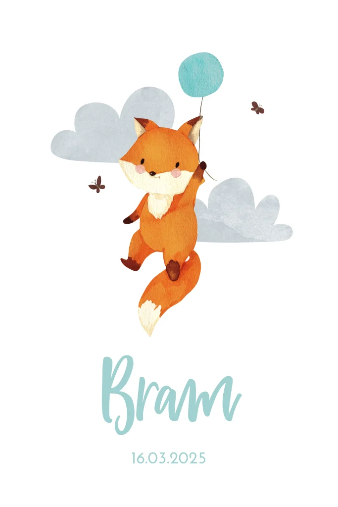 Grappig geboortekaartje staand model met vosje die aan een blauwe ballon hangt tussen twee blauwe wolken. Op de achtergrond twee kleine vlinders.
