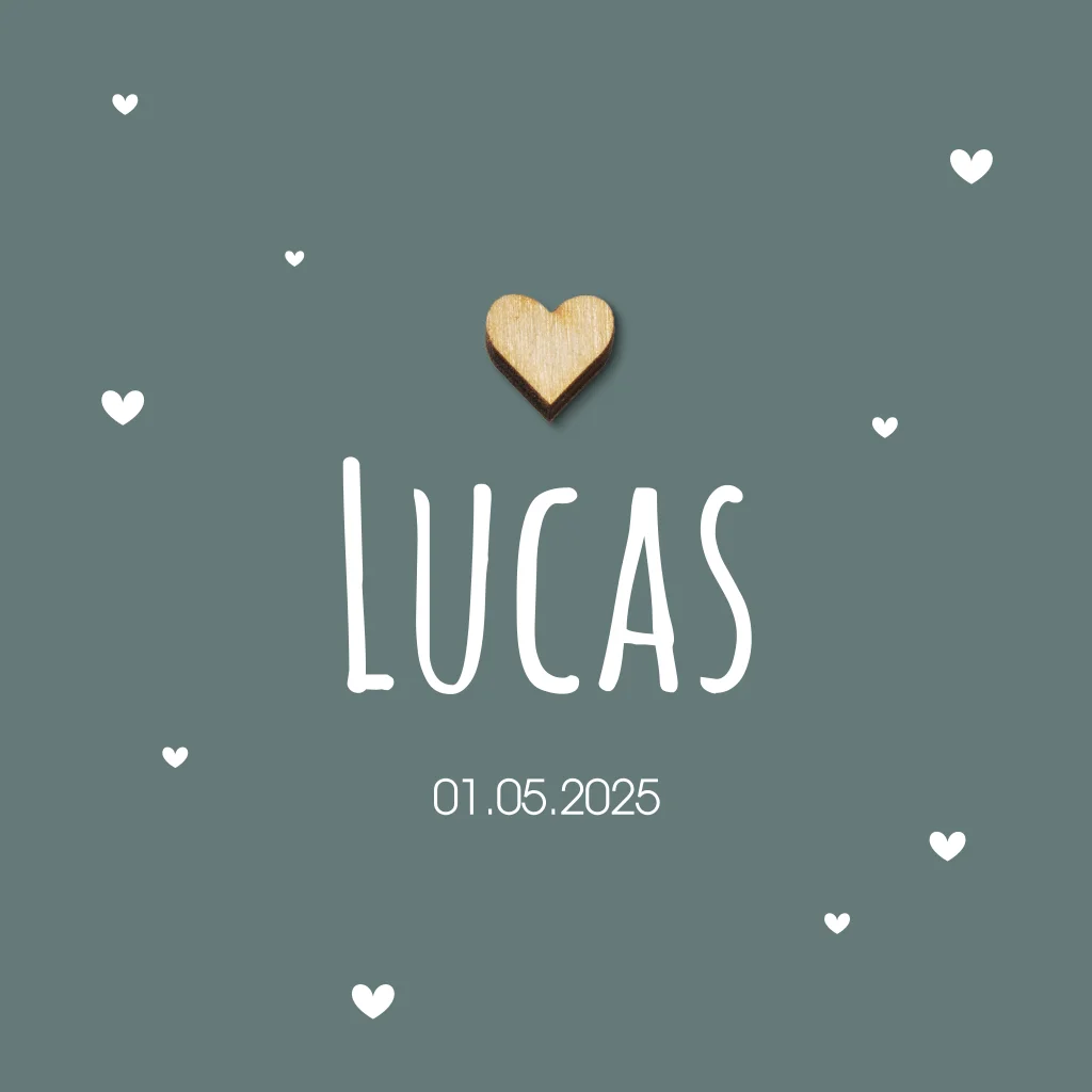 Trendy geboortekaartje voor een jongen met een hip lettertype in het wit. Op de donkergroene achtergrond komen de witte hartjes extra mooi uit. Ook het houten hartje past helemaal bij de kleuren en de stijl van het kaartje. Je kunt zelf de naam veranderen in onze online editor.