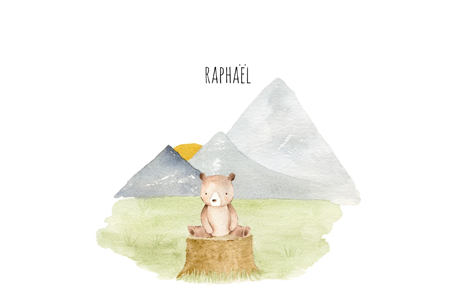 Lief geboortekaartje met een beertje en bergen van watercolour