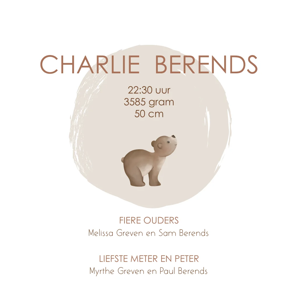 Dit geboortjekaartje is schattig en bijzonder door de linnen-look achtergrond. Zet de naam van jullie pasgeboren kleintje in een witte circel boven het beertje dat opkijkt naar de letters.Totaalprijs: 0 |