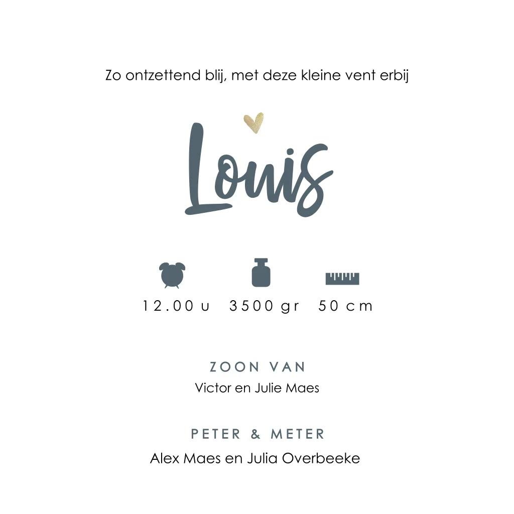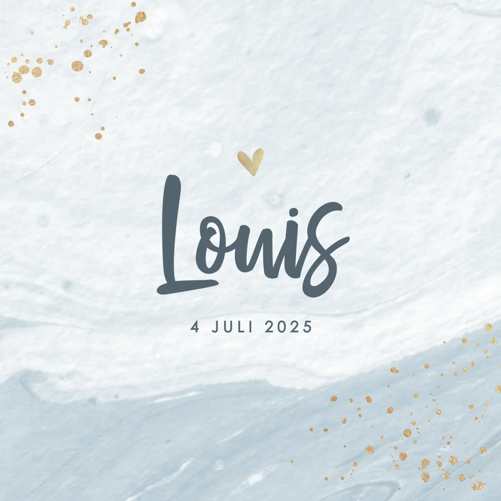 Een vierkant geboortekaartje in blauwe marmer-look met spetters en een hartje op de achtergrond. Je kunt een eigen foto plaatsen aan de binnenkant van de kaart.| Totaalprijs: 0 |