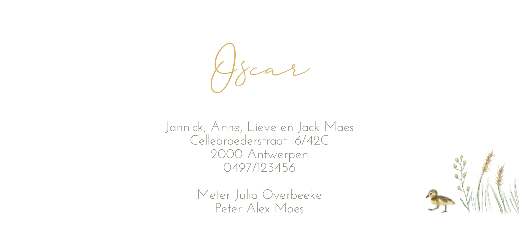 Een origineel, handgeschilderd geboortekaartje met een eenden familie in het riet. Dit geboortekaartje kan eenvoudig worden aangepast door een eendje toe te voegen of weg te halen, afhankelijk van de familiegrootte.