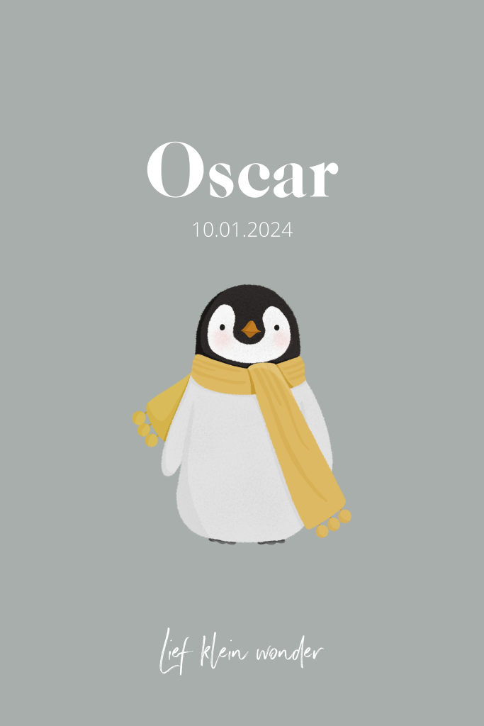 Dit lieve geboortekaartje met een pinguïn erop is een uniek geboortekaartje voor jullie zoontje! De grappige tekening van de pinguïn staat op een grijze achtergrond en de naam van de kleine staat in goudfolie, de tekst is eenvoudig aan te passen in de online editor.