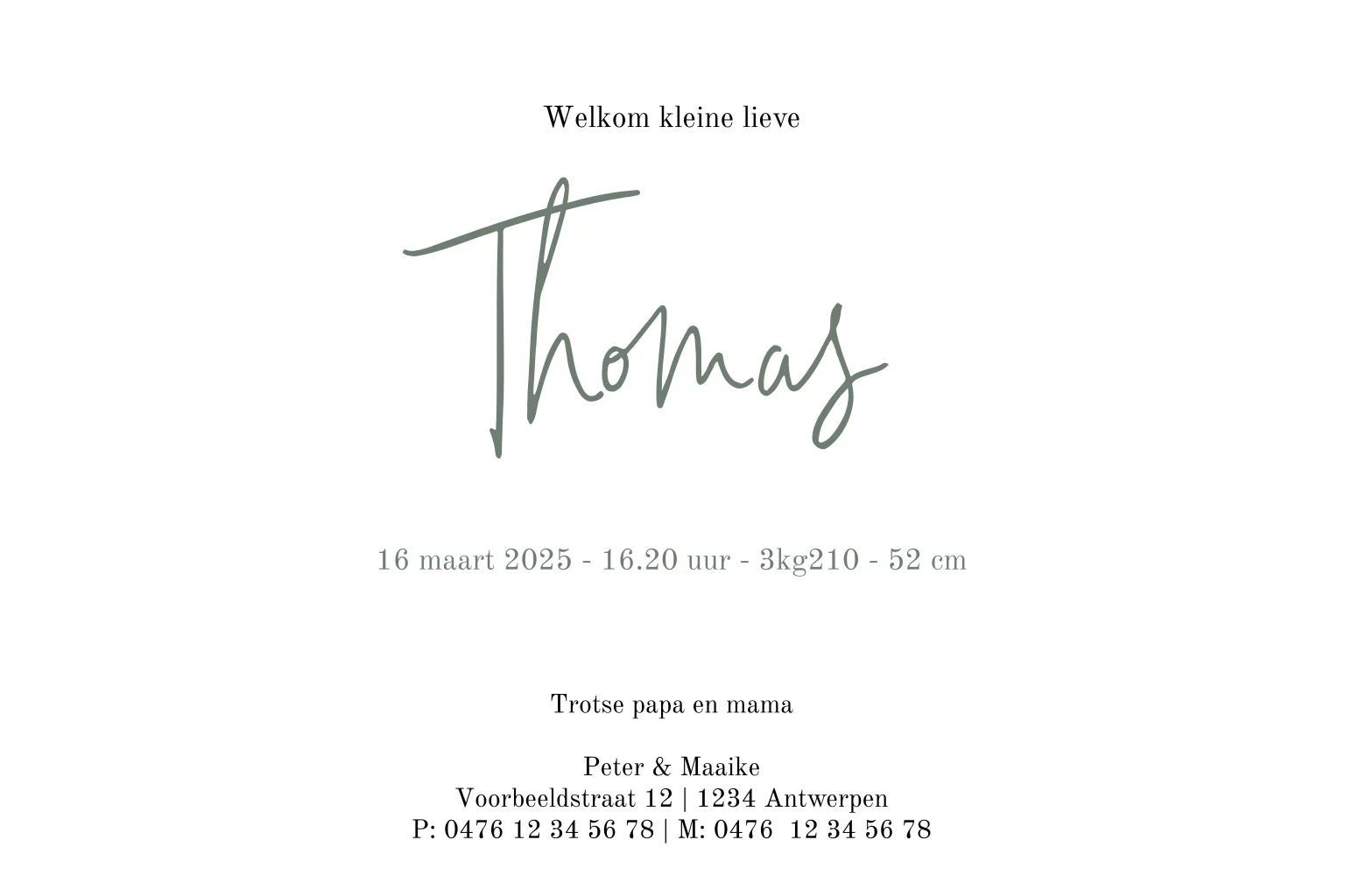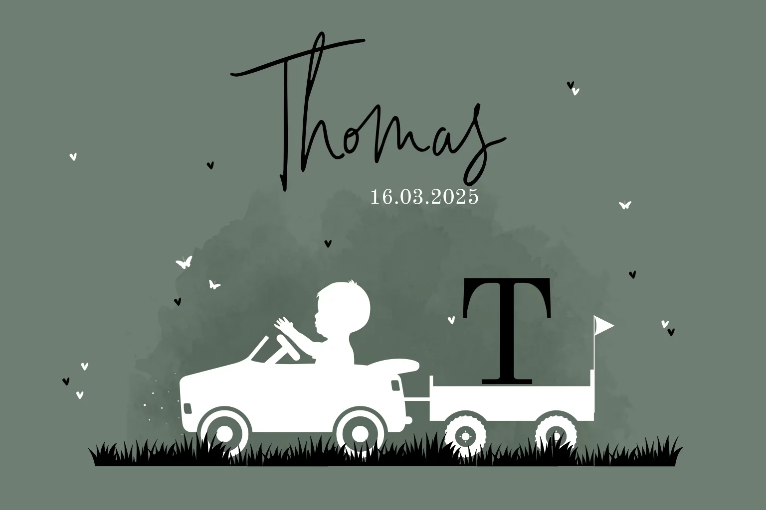 Hip geboortekaartje met een wit silhouet van een kindje in een autootje met aanhanger met daarop het initiaal van jullie kleine. Op de legergroene achtergrond staan kleine hartjes en vlinders in zwart en wit. De tekst kun je eenvoudig zelf aanpassen in de online editor, zo gedaan!