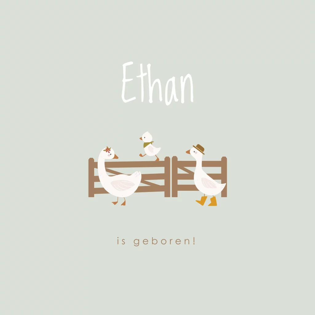Schattig babykaartje voor een jongen! De kaart heeft een leuke illustratie van ganzen bij een boerenhek op een groene achtergrond. Dit kaartje is helemaal hip!