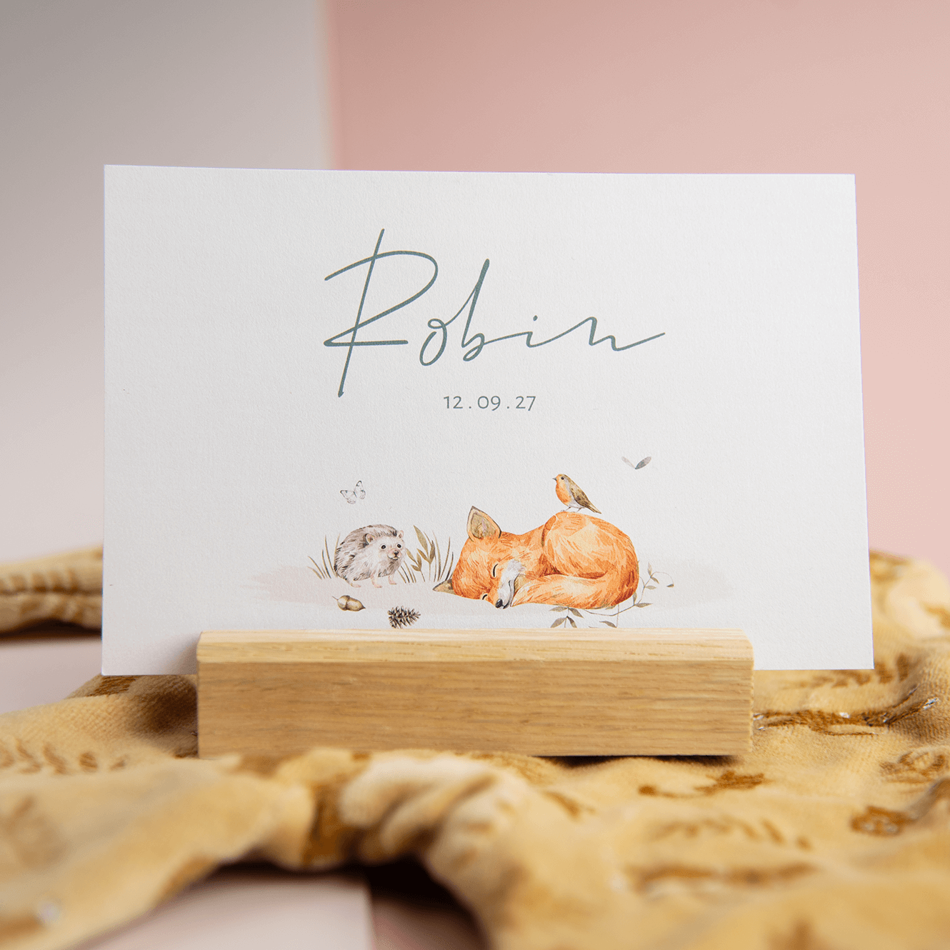 Schattig geboortekaartje in bosthema voor een jongen of meisje! Op de pastelachtergrond zie je een slapend vosje tussen de takjes, met een roodborstje er bovenop, het egeltje kijkt nieuwsgierig toe. De tekst is in verschillende lettertypes en bijpassende kleuren, pas deze naar wens aan in de online editor en bestel een proefdruk.| Totaalprijs: 0 |