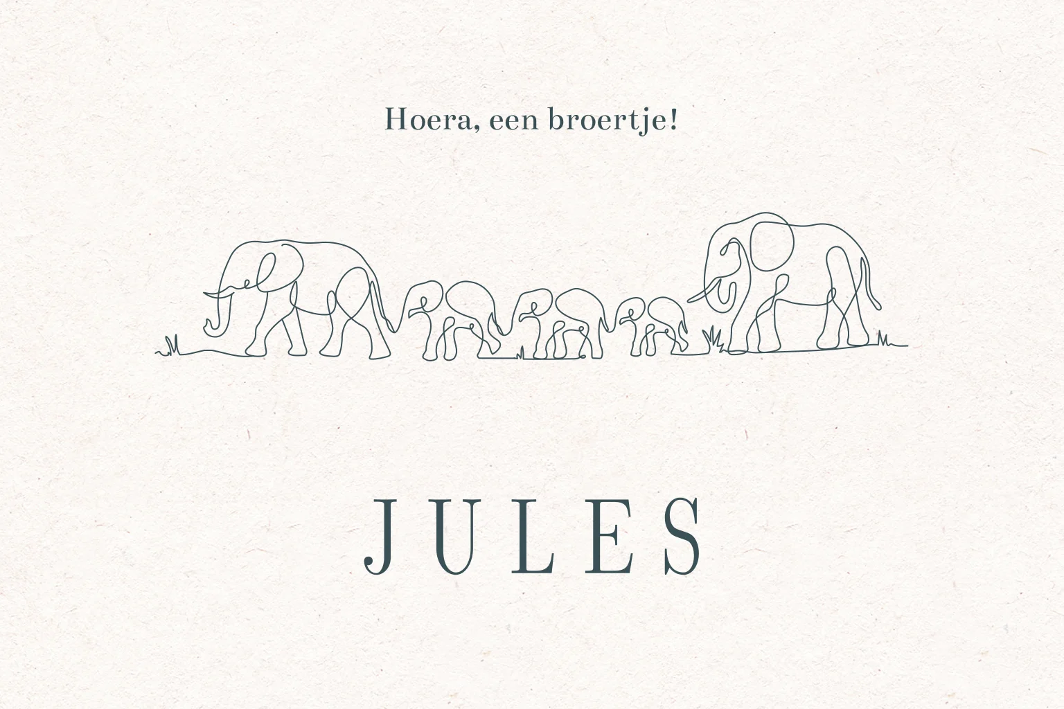 Een liggend geboortekaartje met een lijntekening van een familie olifanten. Personaliseer het kaartje naar eigen wens in de online editor.
