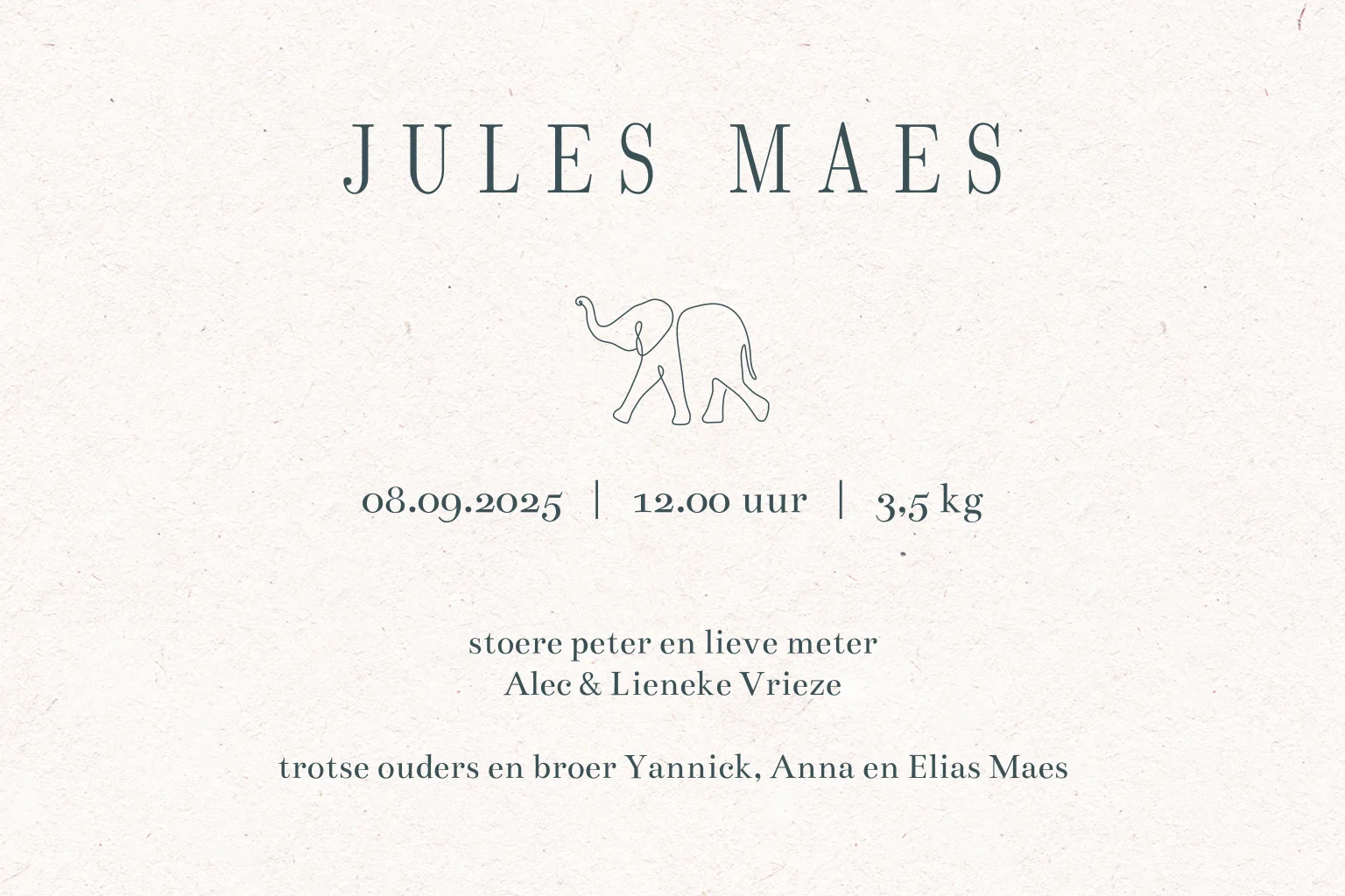 Een liggend geboortekaartje met een lijntekening van een familie olifanten. Personaliseer het kaartje naar eigen wens in de online editor.| Totaalprijs: 0 |