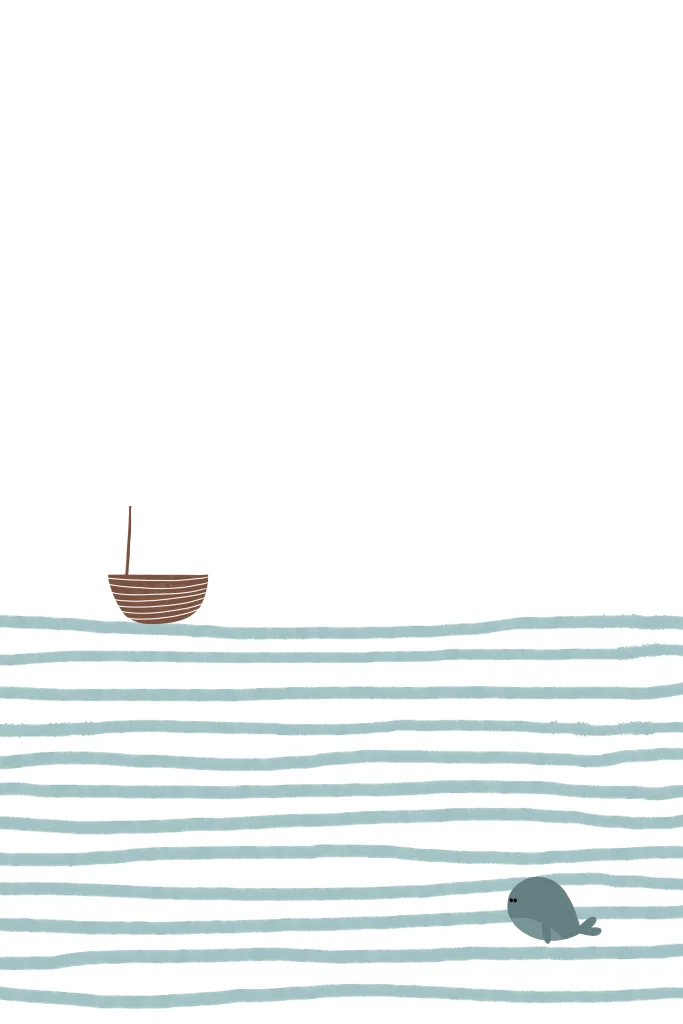 Dit nautische geboortekaartje wordt versierd met een bootje en een walvis in een zee van blauwe strepen. De tekst in goudfolie geeft een tijdloze uitstraling aan het kaartje.