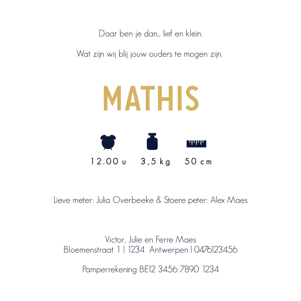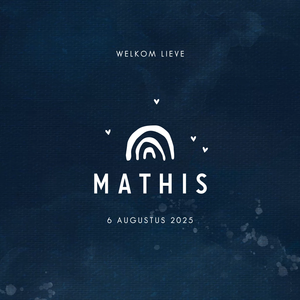 Een vierkant geboortekaartje in donkerblauwe velvet-look. De kleine regenboog en de naam staan beide in goudfolie. Het kaartje is naar eigen wens te personaliseren in de editor.| Totaalprijs: 0 |