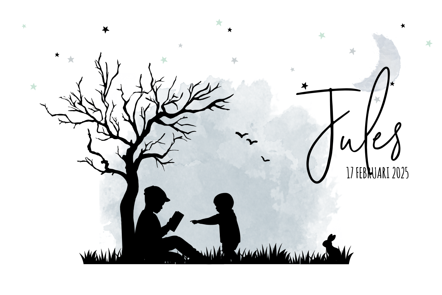 Lief geboortekaartje voor een jongetje met een silhouet van twee broertjes die in het gras onder een boom zitten. In een grijze waterverf kleur is een maan getekend met sterretjes. Op de achterzijde hetzelfde landschap in een andere kleur. Pas eenvoudig zelf de kleuren en de tekst aan in de online editor voor een extra persoonlijke kaart.