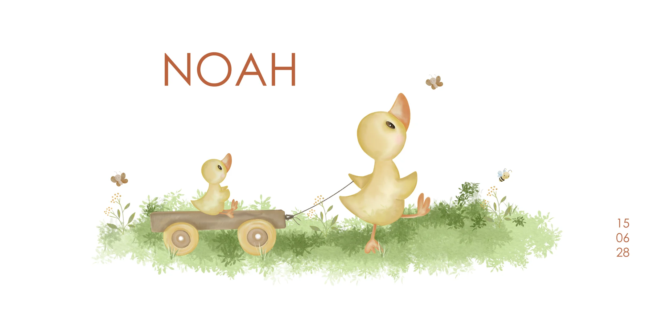 Een super schattig geboortekaartje met twee kleine eendjes in een bloemenveld. De kleinste eend zit in een karretje en wordt voort getrokken door het andere eendje. Dit kaartje is super leuk voor een pasgeboren kindje dat al een grote broer of zus heeft.