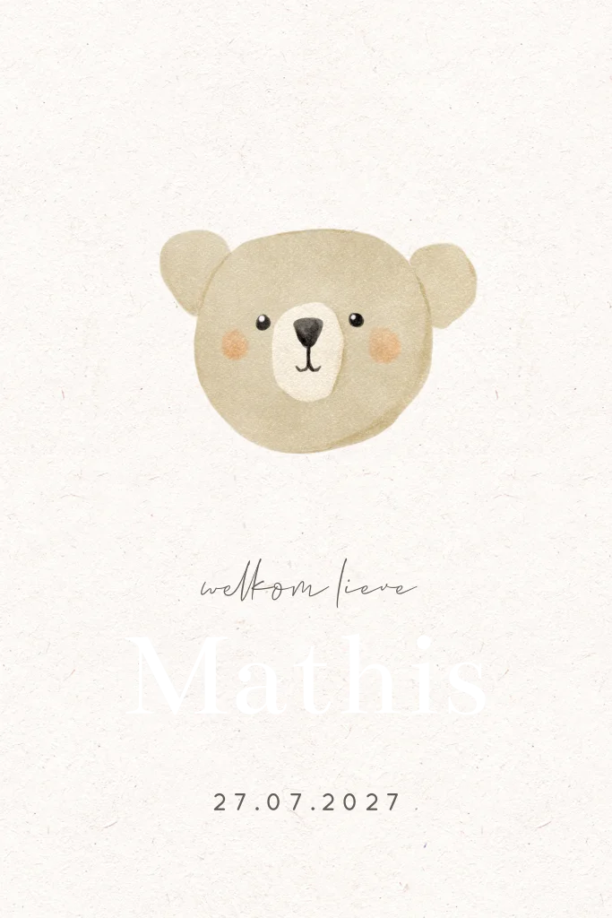 Schattig beige geboortekaartje met illustratie van een vrolijk beertje met rode wangetjes op de voor- en achterkant! De naam voorop staat in goudfoliedruk, dat geeft een luxe accent. Op de achterkant staat de naam in zandkleur en kun je alle tekst toevoegen met informatie over jullie kleintje.