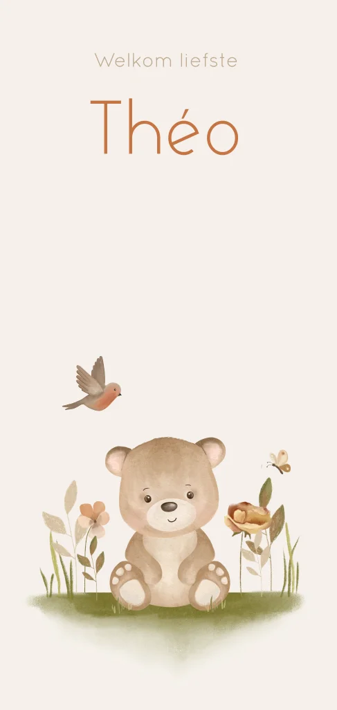Dit geboortekaartje kan zowel voor een jongen als meisje zijn. De letters staan mooi op de zacht gekleurde achtergrond. Tussen de bloemetjes op het gras zit een beertje dat je lief zit aan te kijken. Er vliegt ook een vogeltje en vlinder boven het beertje.