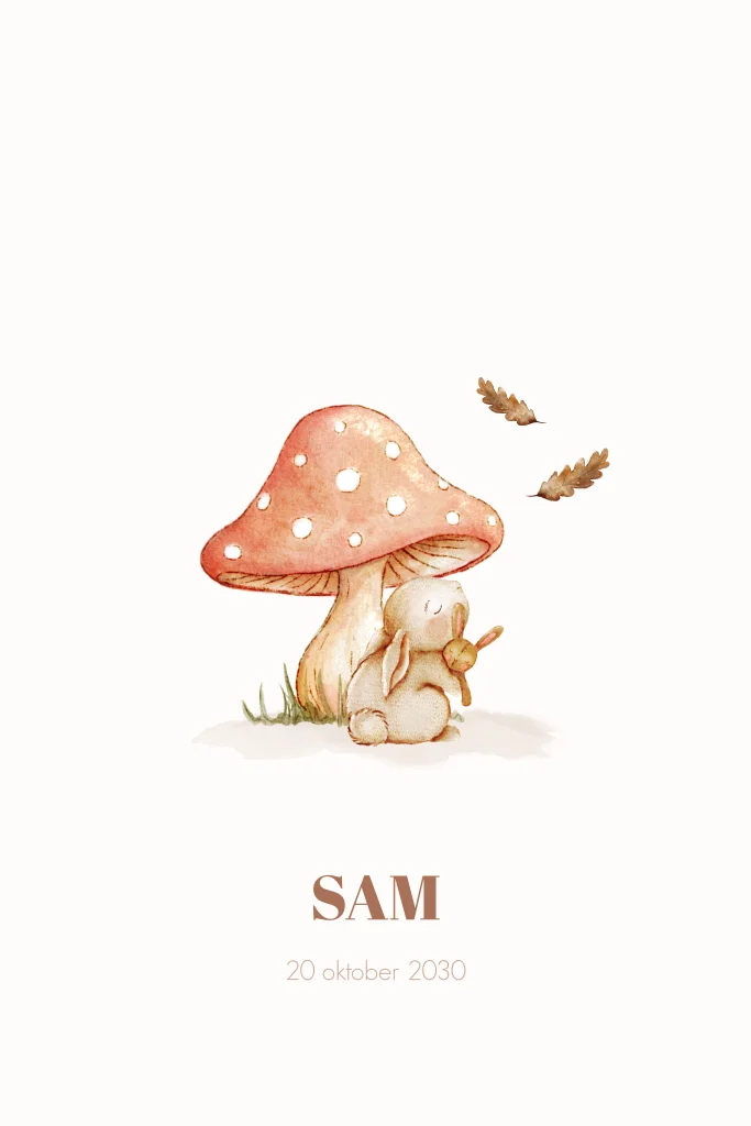Dit schattig herfst geboortekaartje is een tedere illustratie in aquarelstijl, met een snoezig konijntje dat beschutting zoekt bij een paddenstoel met rode hoed en witte stippen. Rondom dwarrelen zachte herfstblaadjes in warme pastelkleuren, wat zorgt voor een gezellig en knus sfeertje. Perfect voor een baby’tje dat het levenslicht ziet tijdens de mooiste maanden van het jaar.