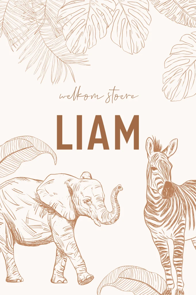 Een origineel geboortekaartje met een junglethema in bruin en beige. Op het kaartje staan een olifant, zebra en een vogel afgebeeld. Aan de rand zijn bladeren getekend.Bekijk ook ons babyborrel uitnodiging.