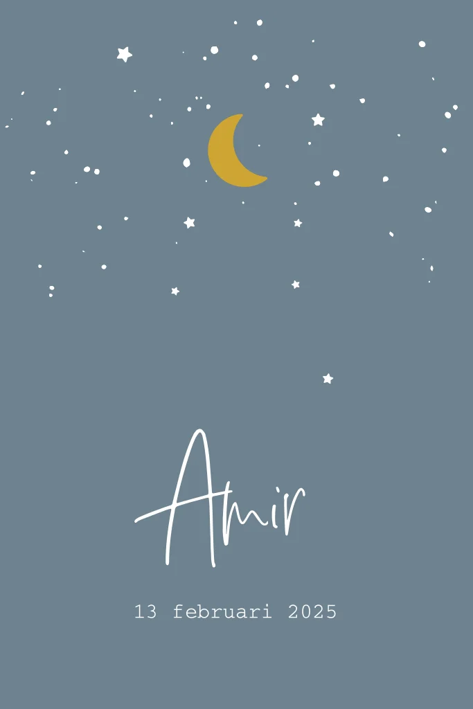 Trendy geboortekaartje voor jullie zoontje in grijsblauw. Onder het gele maantje dat omringd is door witte sterretjes staat de naam van jullie kleine in een hip lettertype. De afgeronde hoeken zorgen voor een zachte uitstraling. In de online editor pas je eenvoudig kleuren en teksten aan naar eigen smaak.