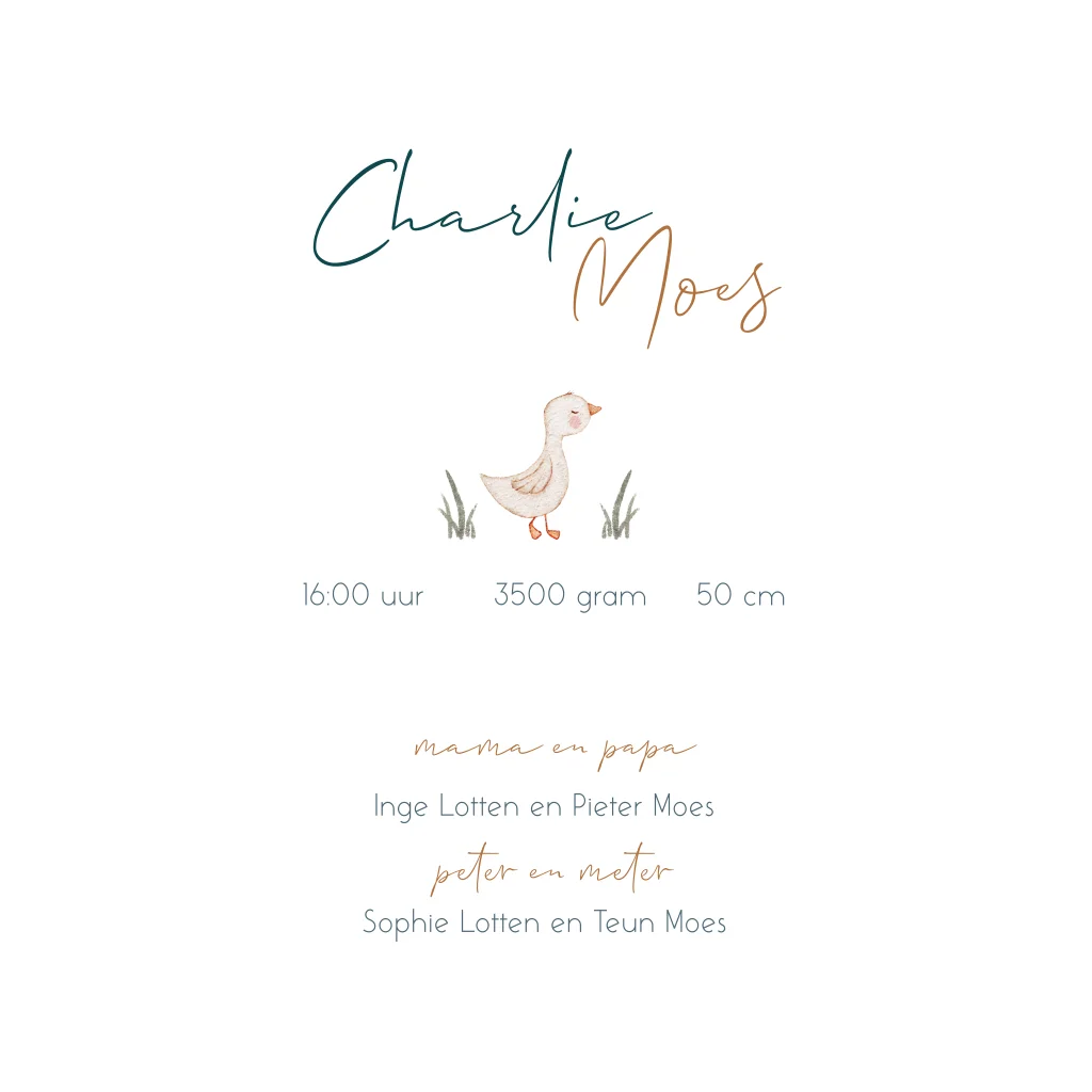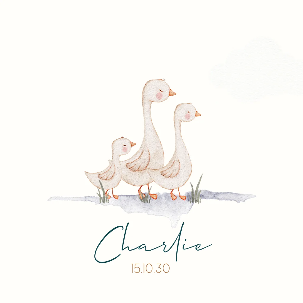 Lief geboortekaartje voor een jongen of meisje in zachte pastelkleur. Op het kaartje staat een ganzen familie, je bepaald zelf hoeveel gansjes erbij mogen staan. De tekst staat in bijpassende kleuren en kan ook naar wens worden aangepast in de online editor.