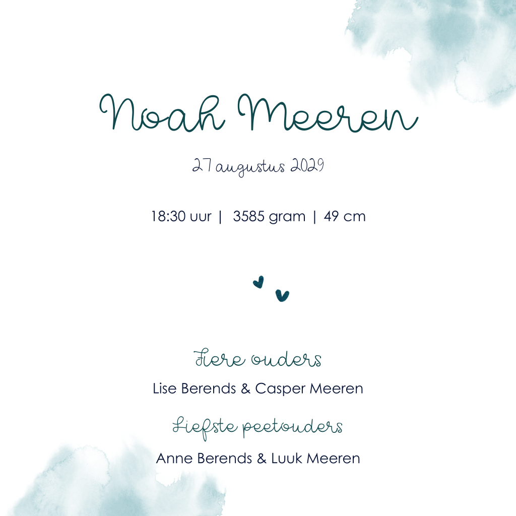 Schattig geboortekaartje voor een jongen of meisje, op een achtergrond van een aquarel zee zwemt een octopus. De naam staat in sierlijke letters. De kleine blauwe hartjes maken dit geboortekaartje helemaal af. Past mooi bij het zeedieren thema. Pas de kaart naar wens aan in de online editor.