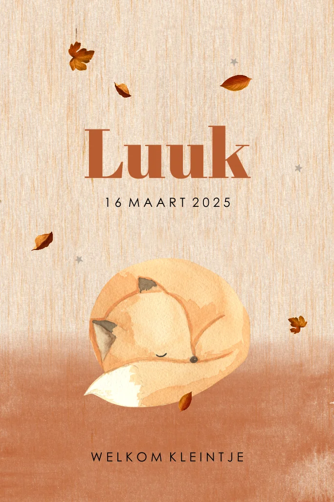 Een origineel geboortekaartje van echt hout met een lief, slapend vosje op een bruin waterverfvlak. De naam staat in stoere roodbruine letters erboven en de dartelende herfstblaadjes maken het helemaal af, superleuk!