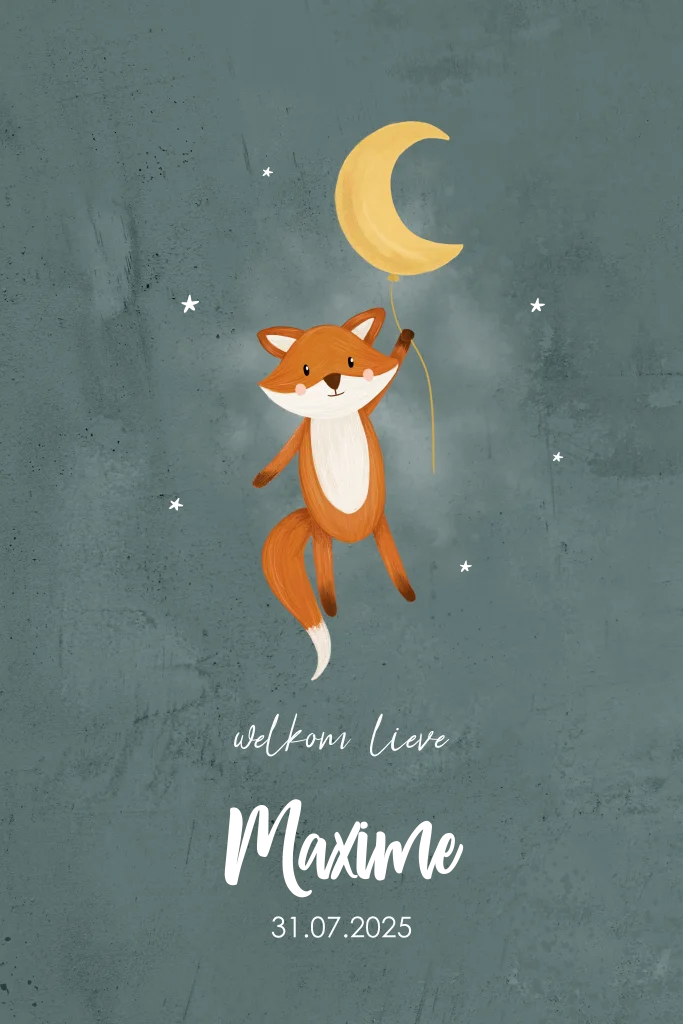 Origineel geboortekaartje met een bruinwit lief vosje dat zich vasthoudt aan de maan. De achtergrond is een blauwgrijze lucht in aquarel met sterretjes.Heb je ook ons bijpassende babyborrel uitnodiging al gezien?