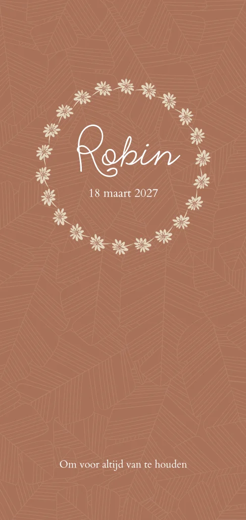 Een vintage geboortekaartje voor de geboorte van jullie kindje met een takjespatroon op de bruine achtergrond, romantisch! De naam staat in een cirkel van witte bloemetjes, op de achterkant komt het takjespatroon terug op een witte achtergrond. Bij de tekst staan leuke symbooltjes, pas de naam en teksten eenvoudig zelf aan in de online editor.