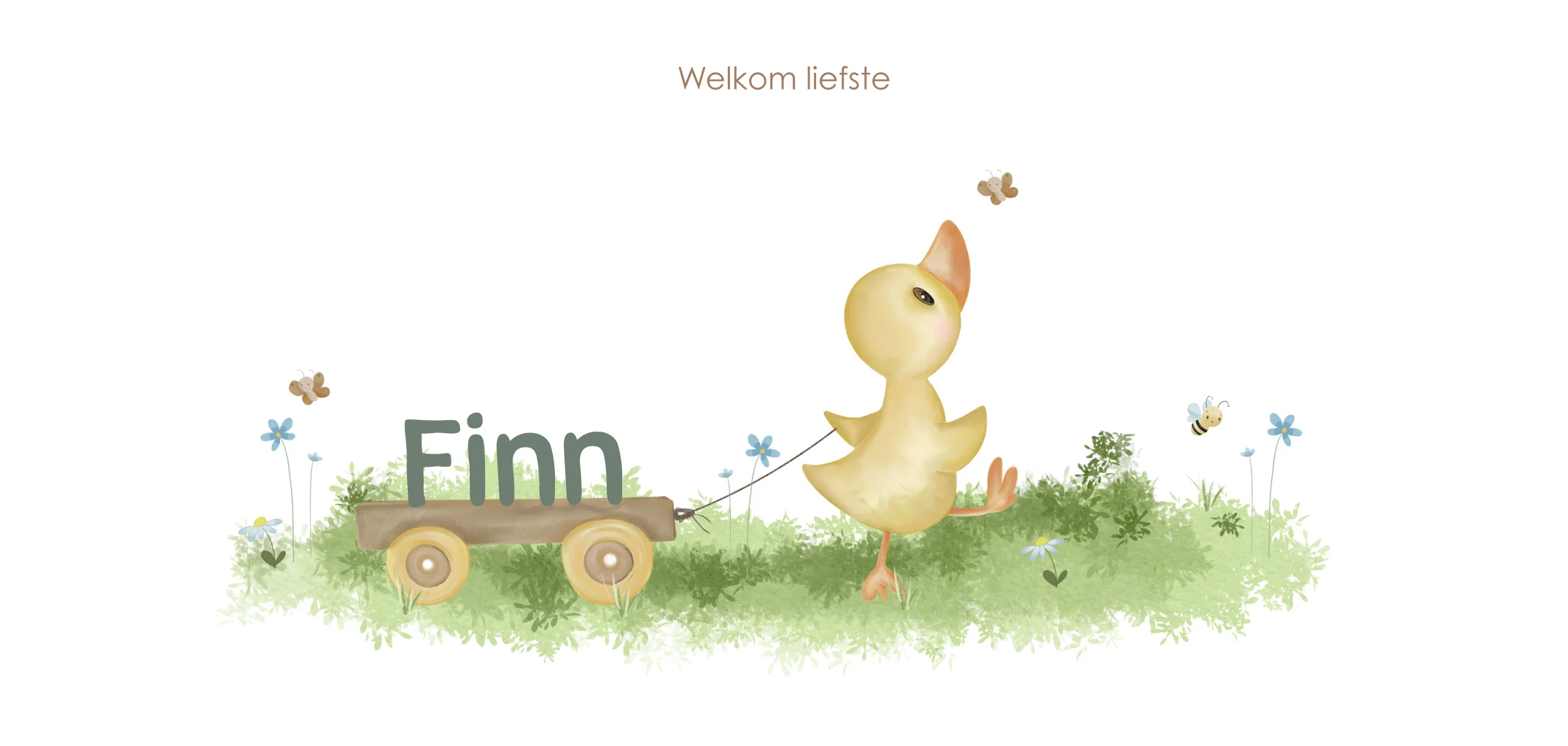 Dit schattige geboortjekaartje is ideaal voor jullie pasgeboren kleintje. Een lief eendje trekt een karretje voort door een bloemenveld en op dat karretje staat de naam van jullie kindje in speelse groene letters.