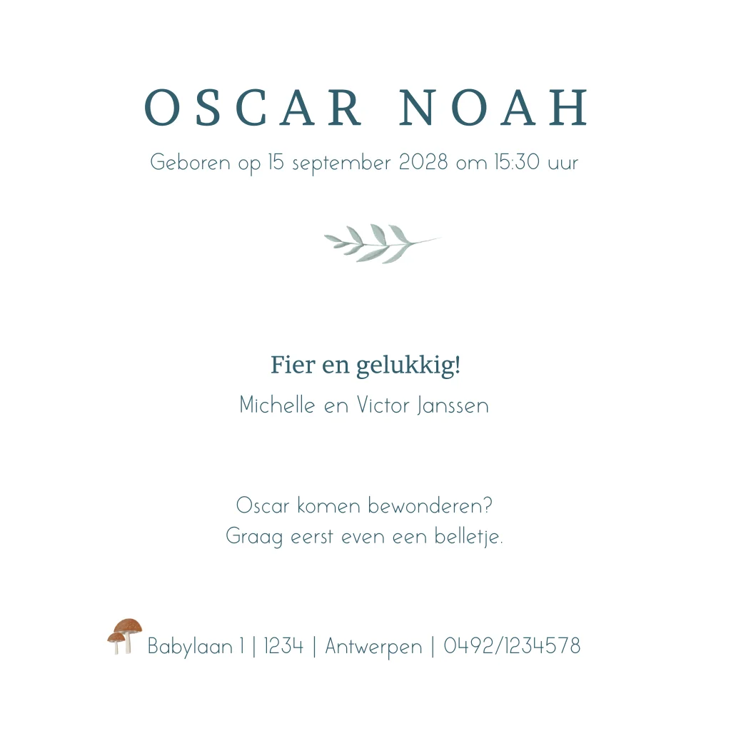 Een grappig en lief geboortekaartje met een kleine dino op een fietsje. Blaadjes dwarrelen in het rond en kleine paddenstoelen staan naast het pad.| Totaalprijs: 0 |