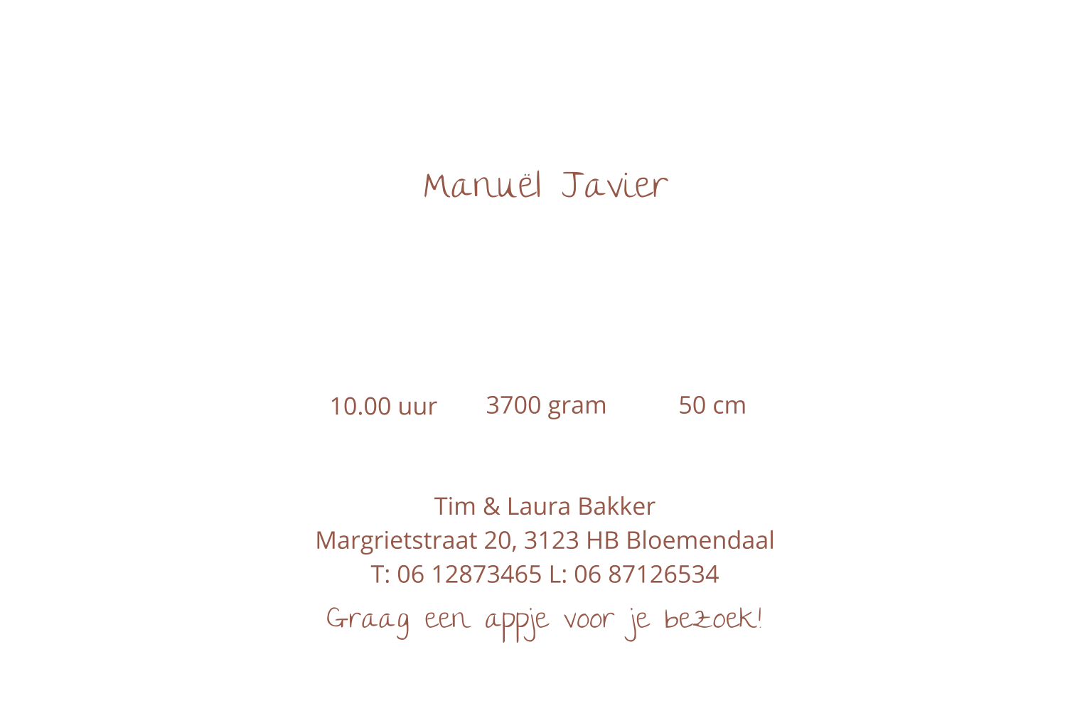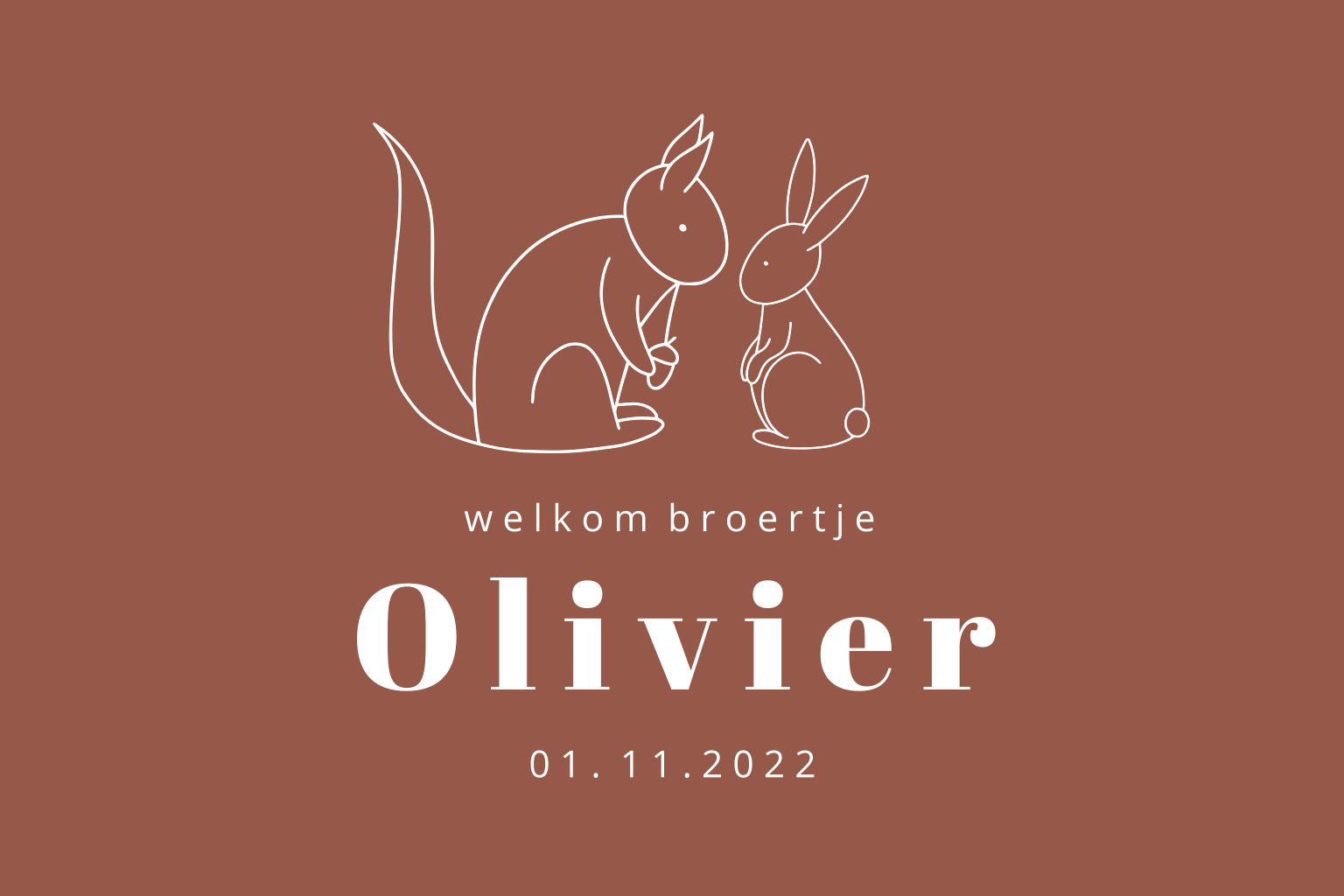Lief kaartje in roodbruin om de geboorte van jullie zoontje en/of baby broertje aan te kondigen. De naam staat in trendy grote letters, erboven een schattige tekening van konijntjes. Door het gebruik van goudfolie krijgt het kaartje een luxe uitstraling. Ook aan de binnenzijde is goudfolie gebruikt, hier is de tekst roodbruin op een witte achtergrond. Stoer kaartje!